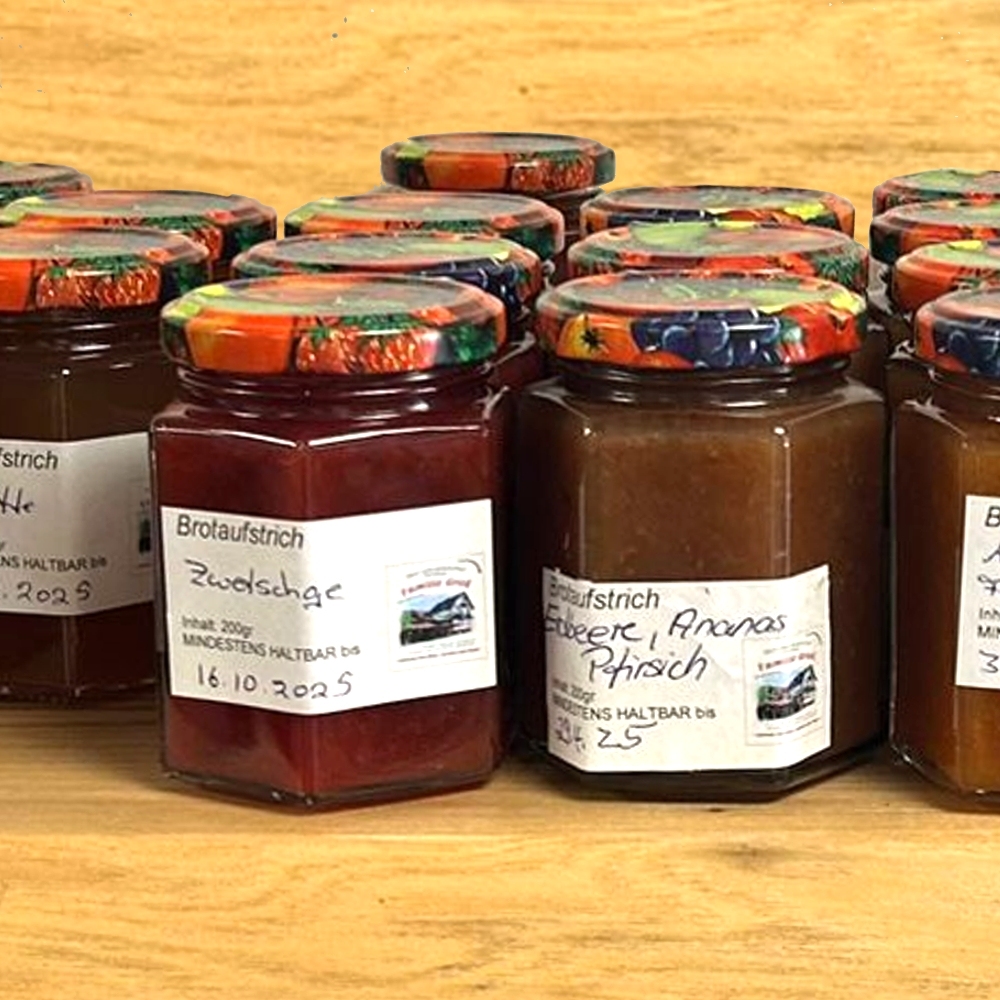 Darüber hinaus finden Sie ein reichhaltiges Angebot an hausgemachten Marmeladen, Honig der Wanderimkerei Schneider, verschiedenen Säften und Apfelsaft aus eigener Produktion.