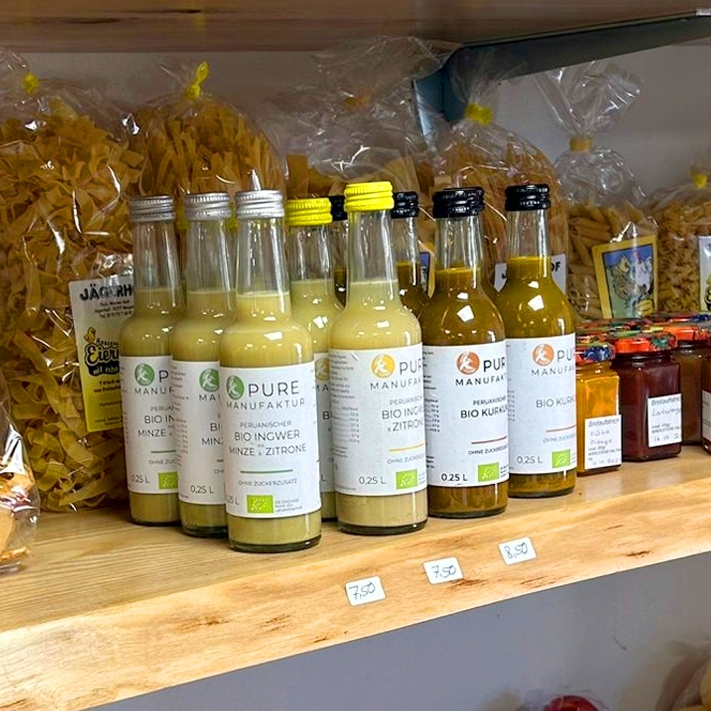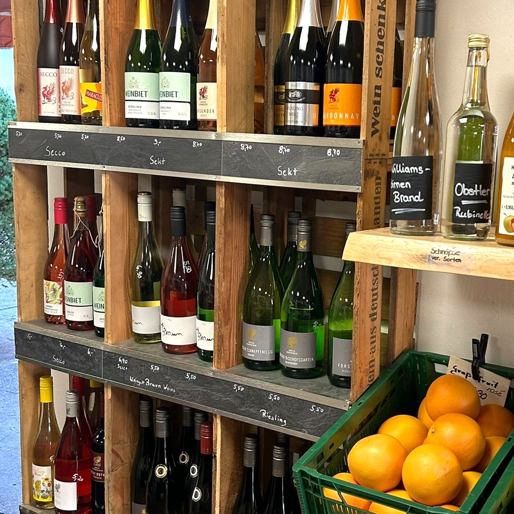 In unserem Hofladen finden Sie ein vielfältiges Angebot an regionalem Obst, Gemüse, Eiern, Nudeln, Brotaufstrichen, Säften und Weinen, ergänzt durch eine feine Auswahl an überregionalem Obst und Gemüse.