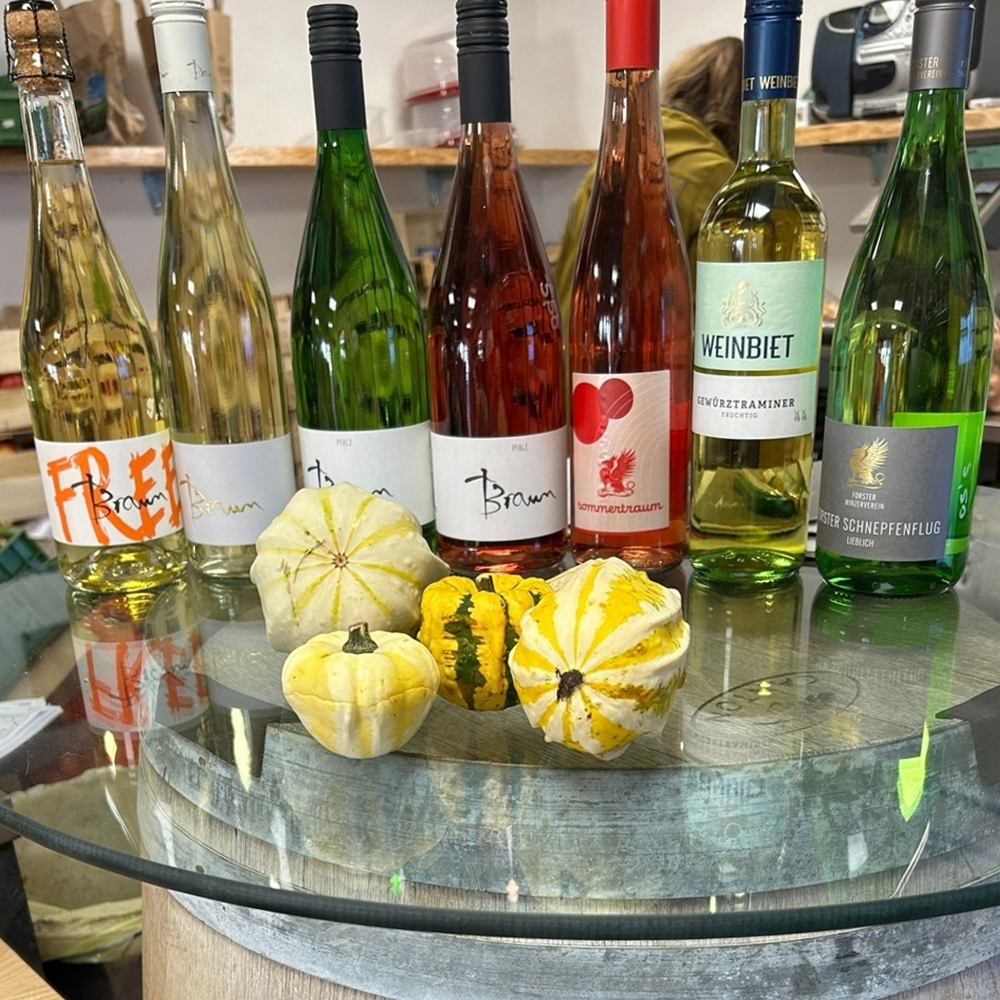 Wir bieten Ihnen eine Auswahl an ausgesuchten regionalen und saisonalen Weinen des Weinguts Braun Meckenheim, des Winzervereins Forst und der Weinmanufaktur Weinbiet Mussbach.